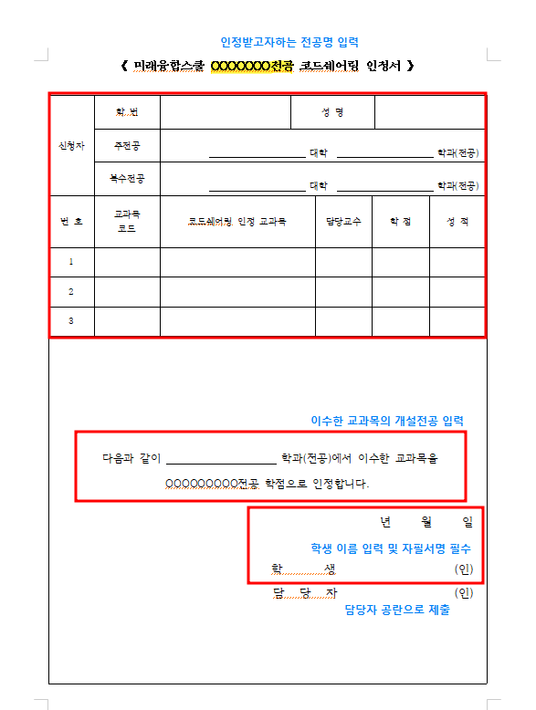 [양식] 타과교과목·코드쉐어링 인정원 신청서(디지털인문예술.융합관광경영.의약신소재.융합신소재)