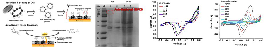 - Glucose-6-phosphate(G6PDH), NADH oxidase와 같은 산화환원 효소는 전기화학 바이오센서에 널리 적용되어 왔습니다. MIN Lab.에서는 이러한 산화환원 효소의 표면발현을 통해서 고감도의 전기화학 바이오센서를 개발해왔습니다. 기존의 바이오센서는 단백질인 효소를 전극 표면에 고정하기 위하여 별도의 물리적, 화학적 고정 공정을 필요로하고, 이 과정에서 무작위 배향이나 화학반응으로 인한 효소의 활성도가 감소하는 경우가 많습니다. MIN Lab.에서는 고활성의 산화환원 효소를 대장균에 표면발현하는 기술을 보유하고 있으며, 이를 통하여 고감도의 전기화학 바이오센서를 구현하였습니다.